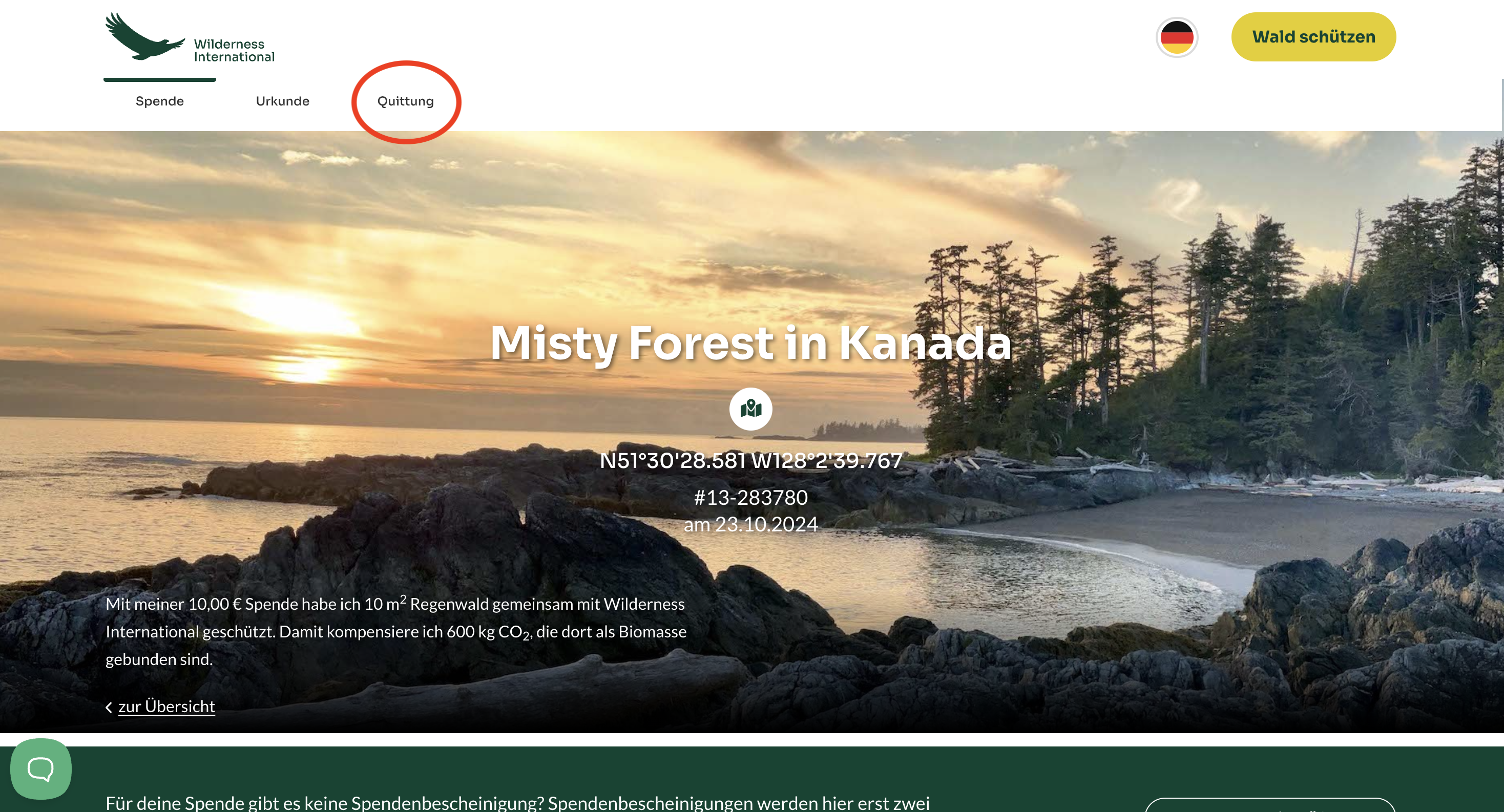 Zwei Wochen nach deiner Spende erhältst du von uns eine Benachrichtigung mit einem Link zu deiner Spendenbescheinigung. Diese steht, genau wie die Urkunde, im Spendenportal zum Download zur Verfügung. Alternativ kannst du auch hier einen Link zum Spendenportal anfordern, der 30 Minuten lang gültig ist. Im Spendenportal wählst du deine Spende aus, klickst auf “Deine Dokumente” und anschließend im Menü oben links auf “Quittung”. Bitte vergiss nicht, deine Meldeadresse hinzuzufügen, um den Vorgang abzuschließen. Die Bearbeitung ist über den kleinen Stift möglich. Falls du schon zuvor gespendet und deine Adresse hinterlegt hast, musst du das nicht erneut tun.